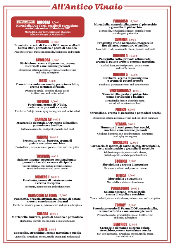 Bologna Il menù 09/12/2024 - All'Antico Vinaio Bologna, adesso è realtà. Siamo in Via Santo Stefano 6a, 40125 Bologna BO. Orario di apertura: dal lunedì alla domenica dalle ore 10:00 alle 22:00.